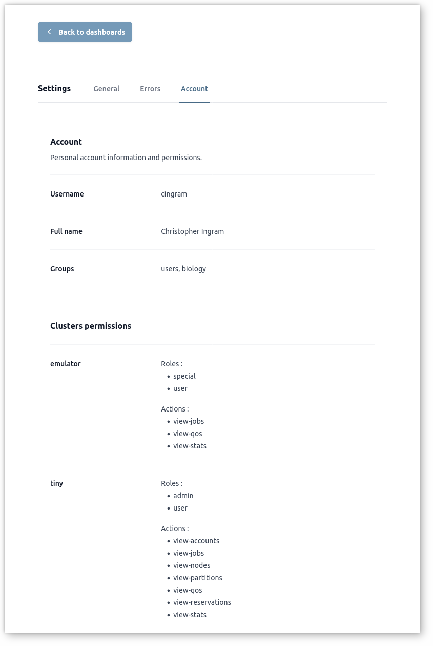 To help understand roles and permissions granted by authorization policy on clusters, users can go in menu:Settings[Account] to view their permissions on clusters. For example: